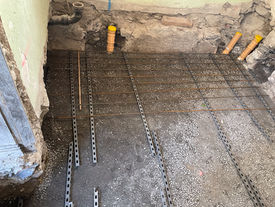 Zwischen dem 17. und 24. März 2025 wird Magerbeton und Armierungsstahl verarbeitet. Regelmässiges Messen stellt sicher, dass das Fundament exakt auf Höhe liegt. Das Stahlgeflecht wird ca. zwei Zentimeter innerhalb der zwanzig Zentimeter hohen Betonummantelung liegen.